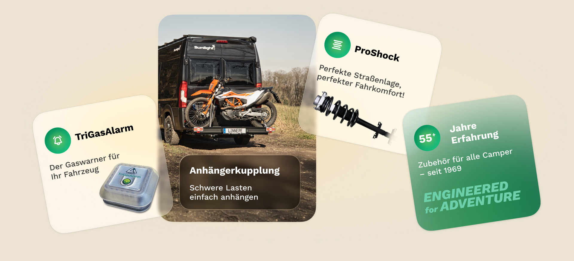 Von Gaswarnern über Anhängerkupplungen bis zu ProShock-Fahrwerken entwickelt Linnepe Lösungen, die Sicherheit, Komfort und Fahrfreude auf jeder Reise garantieren. Mit über 55 Jahren Erfahrung und höchsten Qualitätsstandards stehen wir für Technik, auf die Sie sich verlassen können. Robust, zuverlässig und perfekt auf die Anforderungen von Campern abgestimmt.
